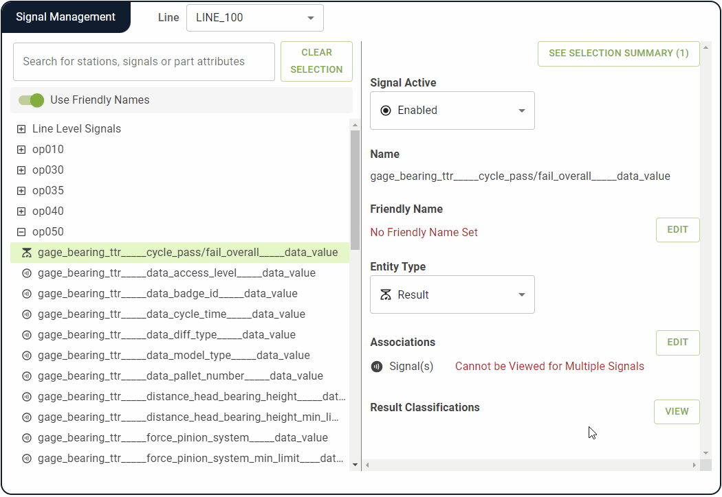Stations, signals and part attributes can be configured using the Signal Management module. They can either be configured individually or by selecting multiple entities and applying the same properties to all at once. Properties that can be configured include Friendly Name, Entity Type and more.